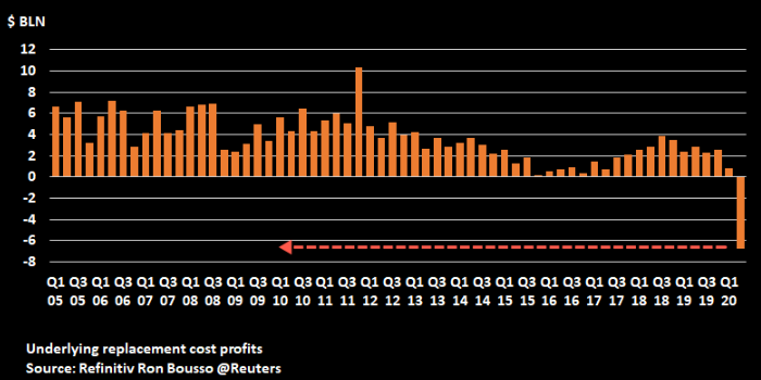 Крупнейшая нефтяная компания США сообщила об убытках в размере 1,08 миллиарда долларов во втором квартале, - крупнейших за всю ее историю, по сравнению с прибылью в 3,13 миллиарда долларов, годом ранее. По его словам, без учета корректировок запасов убыток составил бы 3 миллиарда долларов. В первом квартале убыток был 610 млн долларов . Первые полгода в минус