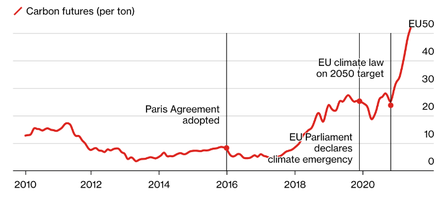 Еще одним важным фактором является государственная политика ценообразования на углерод. В рамках Европейской системы торговли квотами на выбросы компании либо платят за загрязнение окружающей среды, при этом размер платы за последний год вырос в два раза, либо инвестируют в новые технологии, чтобы избежать выбросов углерода. Чтобы сохранить конкурентоспособность промышленных отраслей в условиях более строгой климатической политики, Европа хочет ввести налог на выбросы углерода или штраф за то, что выбросы, связанные с такими товарами, как сталь или цемент, попадают в регион.