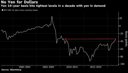 Даже базисные кросс-валютные свопы на более длительный срок, такие как 10-летние свопы между японской иеной и долларом США, находятся на грани превращения в положительные. Эта премия сейчас составляет -34 базисных пункта, что является самым узким уровнем свопа более чем за десятилетие.