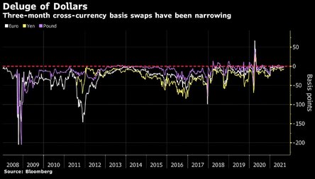 «То, чего раньше не случалось, сейчас происходит», - говорит стратег Credit Suisse AG Золтан Позсар в предстоящем выпуске Odd Lots . Он указывает, что кросс-валютные базисные свопы - это «то, к чему мы привыкли, как к очень отрицательному. Всегда существовал избыточный спрос на доллары, и этот избыточный спрос на доллары сейчас исчезает».