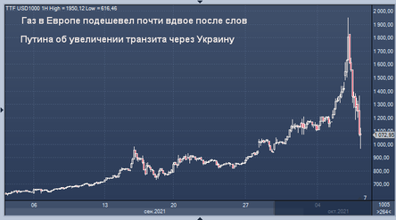 Отсутствие экспорта из России, которая пополняет свои собственные истощенные хранилища, является одной из причин того, что европейские запасы газа более низкие, чем обычно, в это время года. Поставки на континент также были ограничены обслуживанием скважин в Норвегии, в то время как доступность грузов сжиженного природного газа была ограничена остановкой заводов в США из-за ураганов. В среду Путин заявил на энергетической конференции в Москве, что «Газпром» отправит в Европу через Украину больше газа, чем предусмотрено контрактом в этом году, исходя из первых девяти месяцев поставок. Цены на газ, которые в тот же день выросли на 40%, рухнули после этих заявлений Путина.