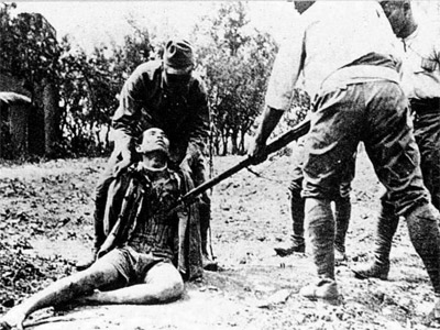 Применяя стратегию "шелковичный червь пожирает тутовый лист", японцы в 1931 году захватили Северо-Восток Китая, а в 1937-м развернули наступление на Пекин, Шанхай, Кантон и другие крупнейшие города Поднебесной. Встречая сопротивление правительственной армии и войск Компартии, японцы решили сломить волю китайцев массовыми казнями и грабежами. С той поры весь мир содрогается при упоминании "изнасилования Нанкина", где за несколько дней было замучено 300 тысяч человек, где только два самурая, Тосиаки Мукаи и Ивао Нода, в ходе соревнования за один день отрубили мечом 106 и 105 голов соответственно. За несколько дней в Нанкине было изнасиловано 20 тысяч женщин. Японцы выстраивали своих жертв со спущенными штанами рядами вдоль улицы и фотографировались на их фоне. Антияпонская война китайского народа продолжалась 14 лет, ее потери исчисляются 35 миллионами человек!