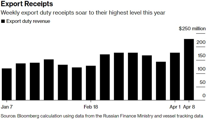 То же самое можно сказать и о доходах от экспортных пошлин, которые российское государство получает от зарубежных поставок. За неделю до 8 апреля они подскочили до самого высокого уровня в этом году после падения в каждую из двух предыдущих недель.