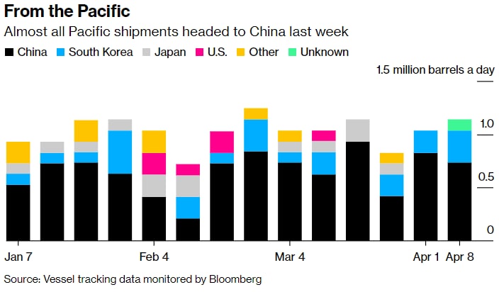 Российские морские потоки сырой нефти. Потоки за неделю, закончившуюся 8 апреля, по сравнению с неделей, закончившейся 1 апреля. Источник: данные отслеживания судов, проверенные Bloomberg.